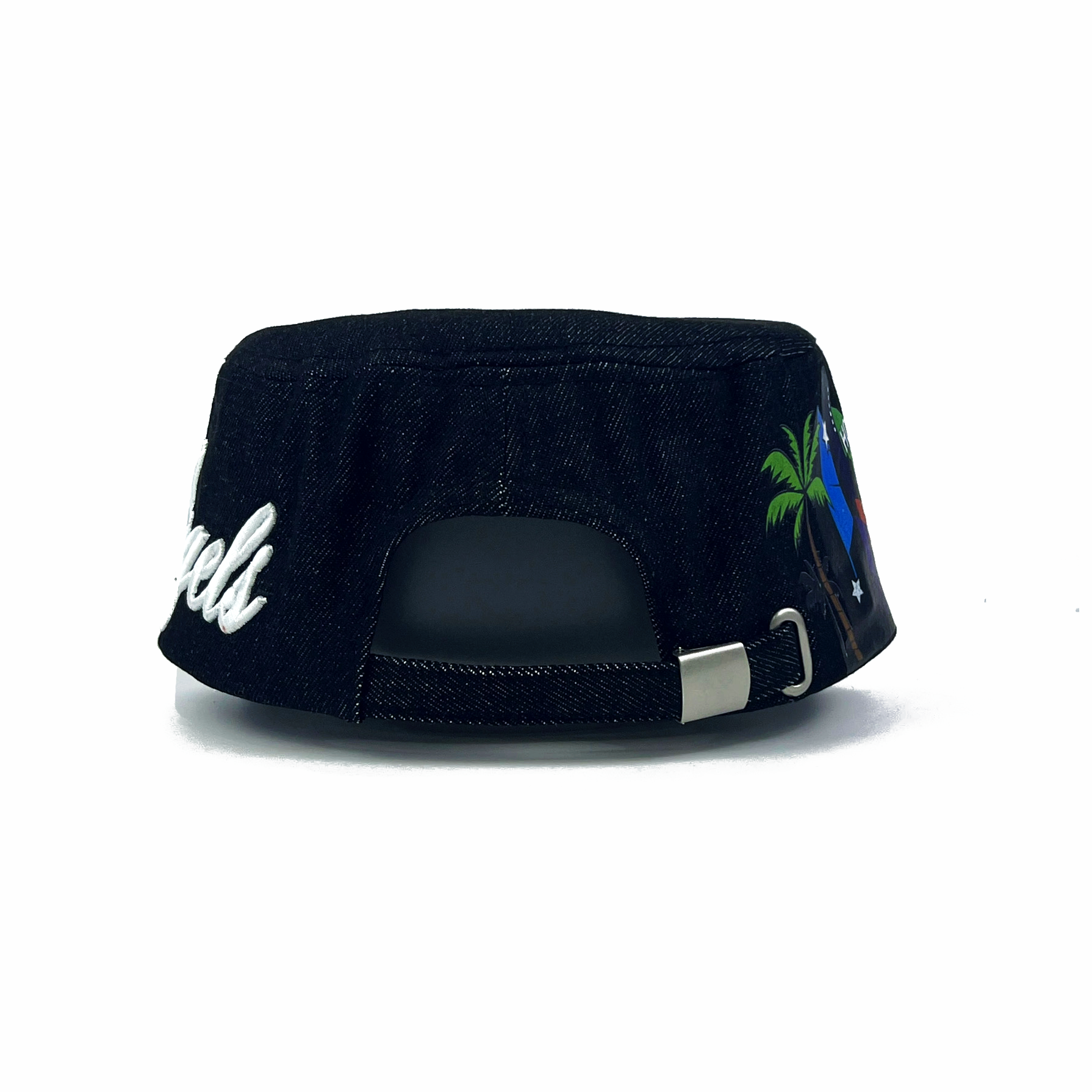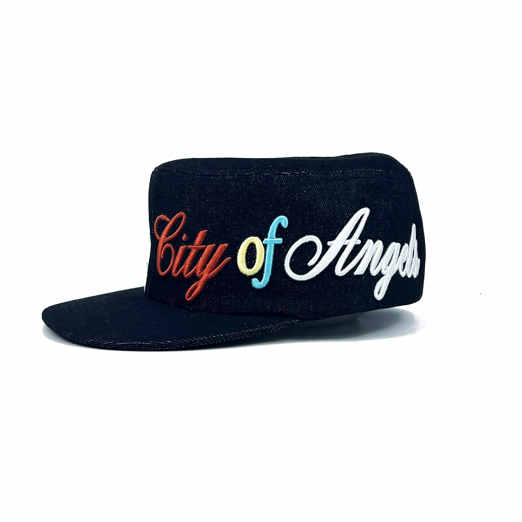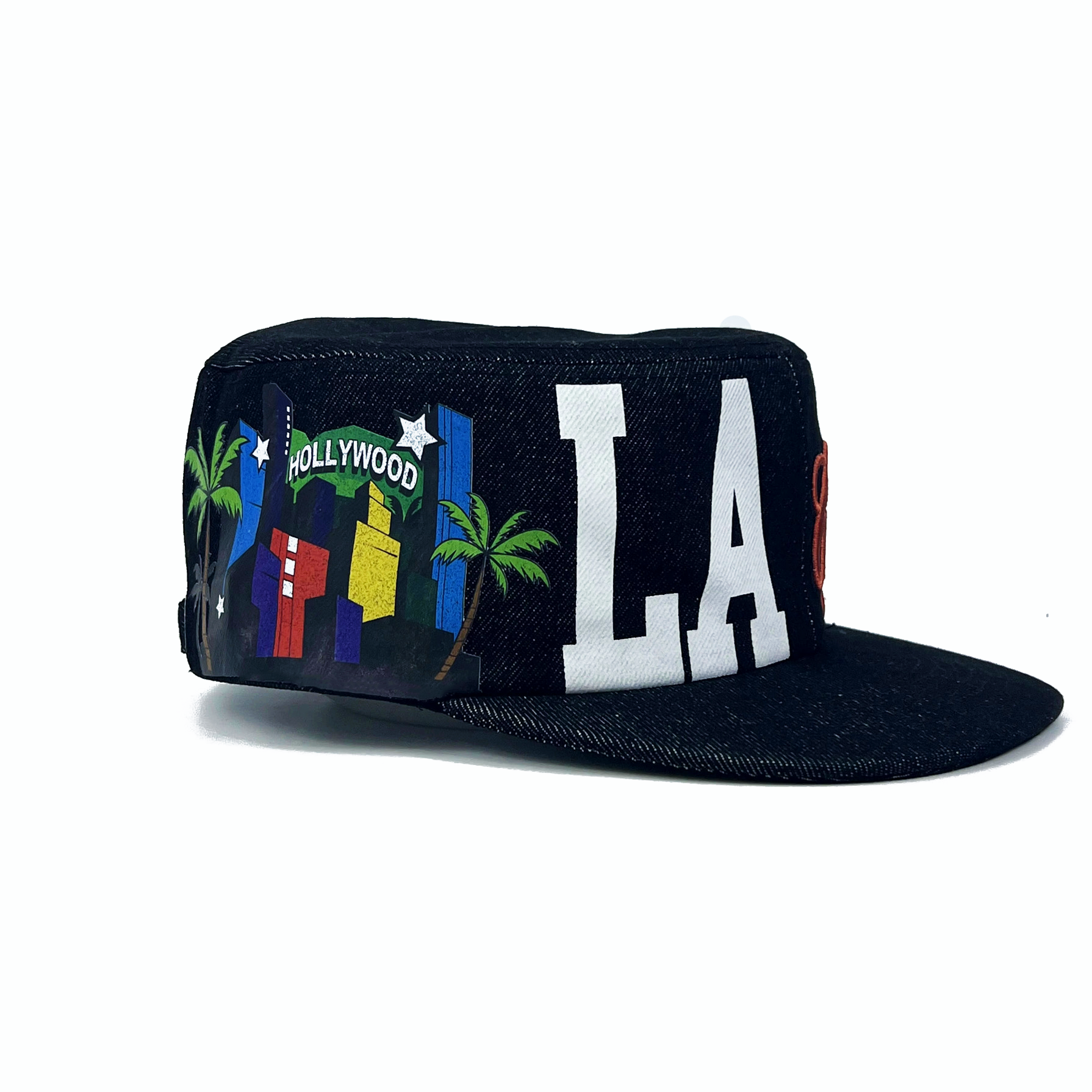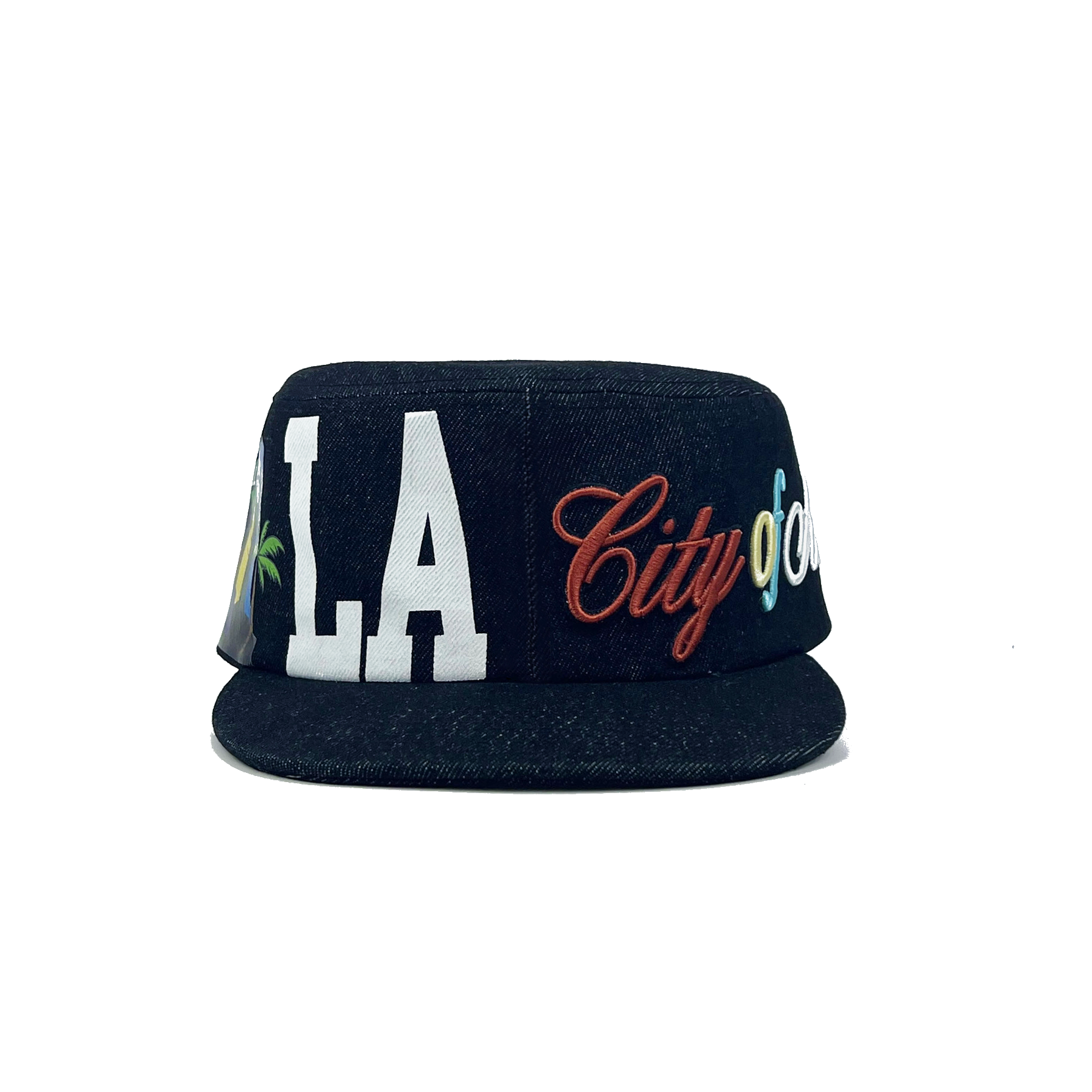 Crafted in dark denim, this mixed-media cadet cap features bold 3D embroidery, screenprint, and DTF printing that capture LA’s vibrant diversity and graffiti culture. The offset “LA” logo symbolizes the city’s raw imbalance between law and life, while the colorful design reflects the energy pulsing through the streets of the City of Angels.